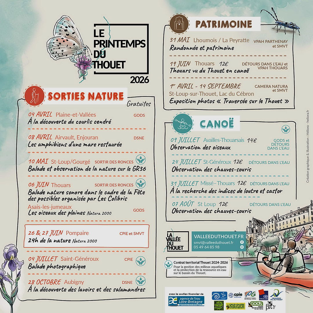 Loisirs, TourismeLe Programme du Printemps du Thouet 202615 dates à noter dans vos agendasLe TalludPublié le 18 mars 2026 Des sorties nature, patrimoine et canoë PrécédentRetour à la listeSuivant