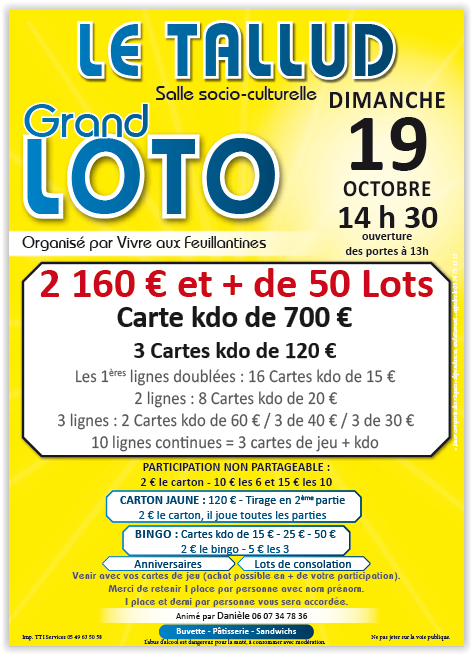 Le19oct.à 14h30 Salle socio-culturelle (grande) Avenue de la Vernière 79200 Le TalludAjouter à mon calendrierLoisirsGrand loto organisé par Vivre aux Feuillantines 2 160 euros de lotsSélection de la vue© OpenStreetMap contributorsFermerPrécédentRetour à la listeSuivant