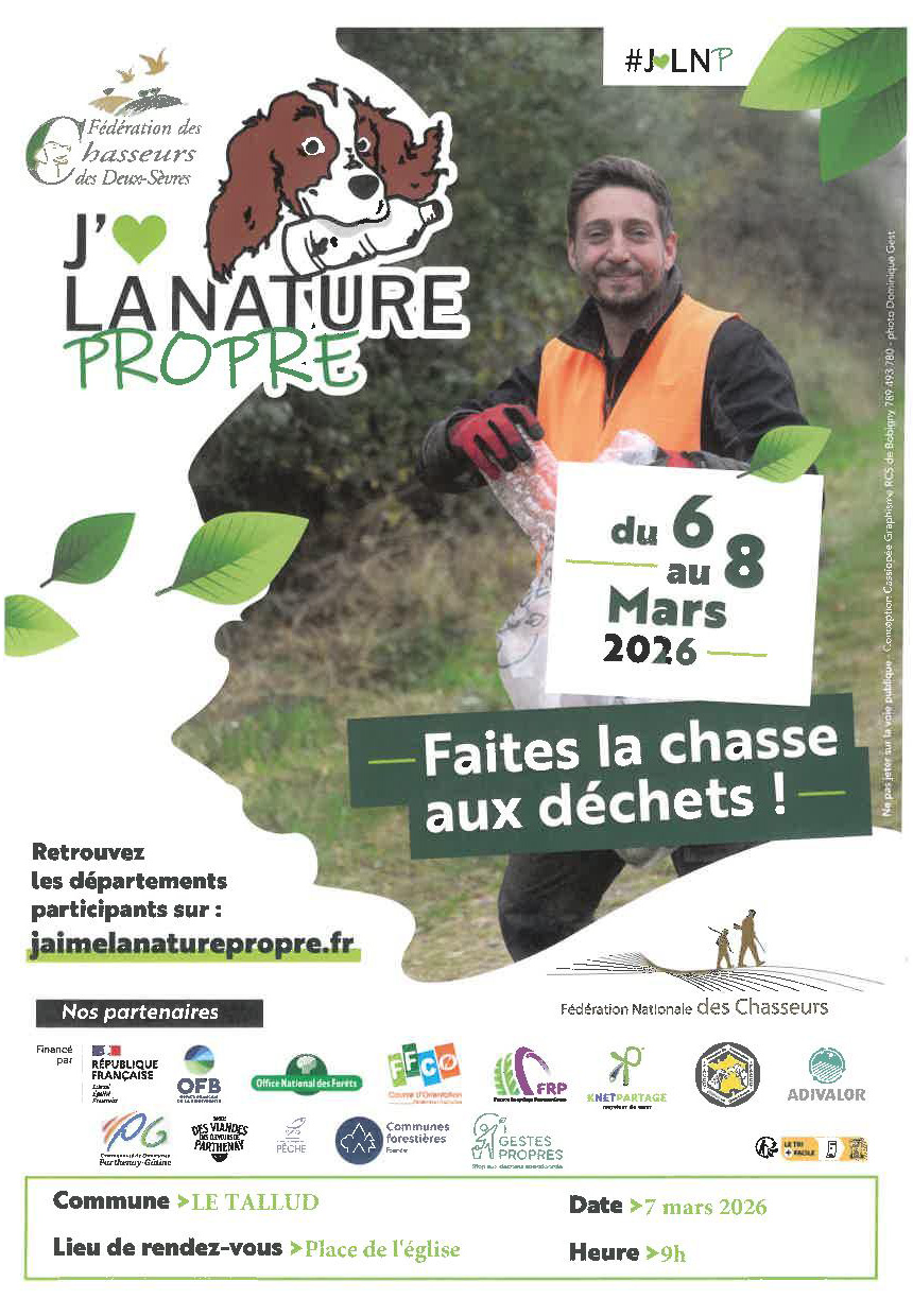 Le07marsà 09h00 Place de l'Eglise du Tallud place de l'église 79200 Le TalludAjouter à mon calendrierVie citoyenneJ'aime la nature propreFaites la chasse aux déchets!Faites la chasse aux déchets!Rendez-vous place de l'église le samedi 7 mars 2026 à 9h00 pour ramasser un maximum de déchets sur la commune.Sélection de la vue© OpenStreetMap contributorsFermerPrécédentRetour à la listeSuivant