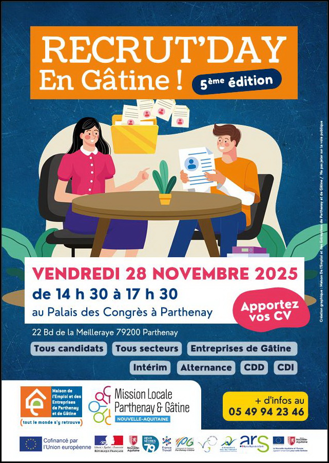 Le28nov.Du 14:30 à 17:30 Domaine des loges 28 Rue du Président Salvador Allende 79200 ParthenayAjouter à mon calendrierEmploiRECRUT'DAY en Gâtine - 5ème éditionEntrée libre, gratuite et sans inscription. Venez avec votre CV !Sélection de la vue© OpenStreetMap contributorsFermerPrécédentRetour à la listeSuivant